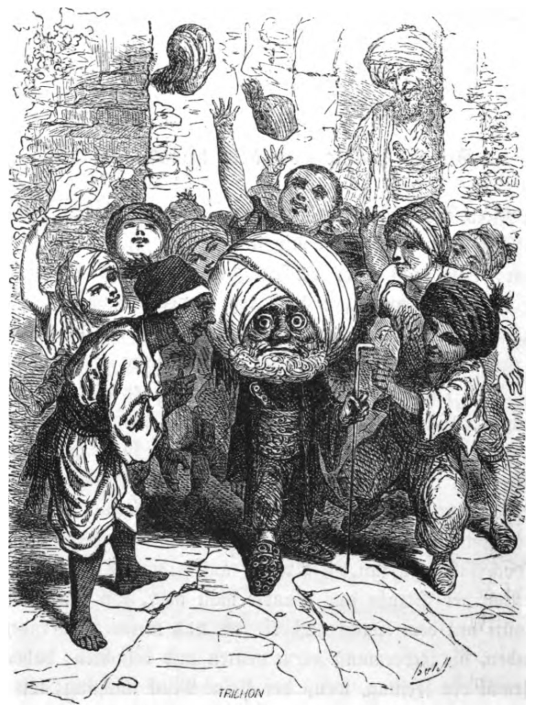 Imatge: Charles Albert d’Arnoux (Conegut com a Bertall) (Paris, 18 de desembre de 1820 – Soyons, 24 de març de 1882). Szene aus Die Geschichte von dem kleinen Muck: Der alte Muck wird von Kindern verspottet.